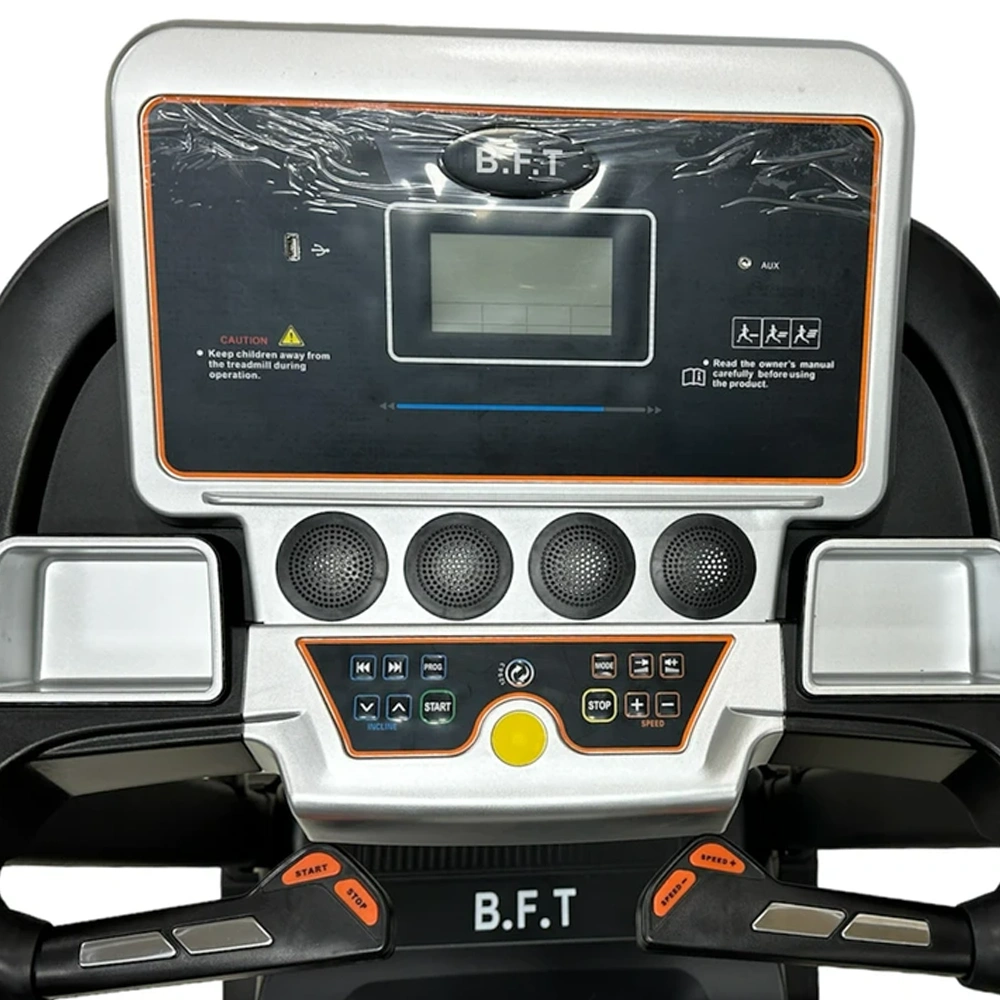 تردمیل BFT‑03 دارای برنامههای تمرینی پیشفرض است و امکان تمرین با مدهای دلخواه را نیز ارائه میدهد. حسگر ضربان قلب، بهصورت بیسیم عمل کرده و اطلاعات دقیقی از وضعیت قلبی کاربر ارائه میدهد. سیستم پخش موسیقی از طریق بلندگوی استریو، با پورتهای ورودی MP3 و USB، امکان اتصال به گوشی یا دیگر دستگاههای پخش را فراهم میکند.